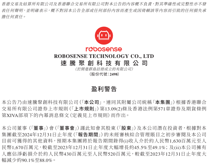 速腾聚创在宣布近期发布业绩预期,其中2024年收入预计同比增长45.5%-49.1%至16.3亿-16.7亿元,亏损同比收窄88%-90%。