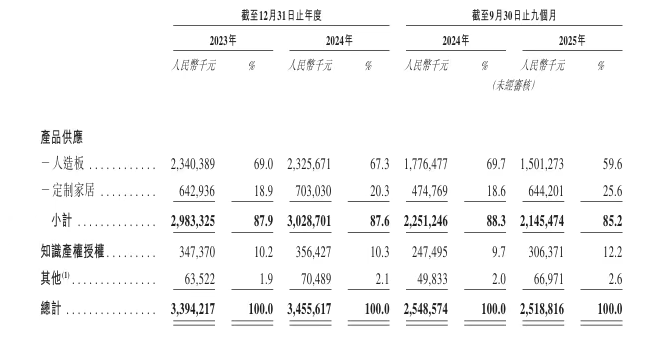 作为传统核心业务,人造板收入占比从2023年的69.0%显著下降至2025年九个月的59.6%。同期,该业务销量从22515(单位:千,下同)下滑至14873(九个月口径),量缩趋势明显。
