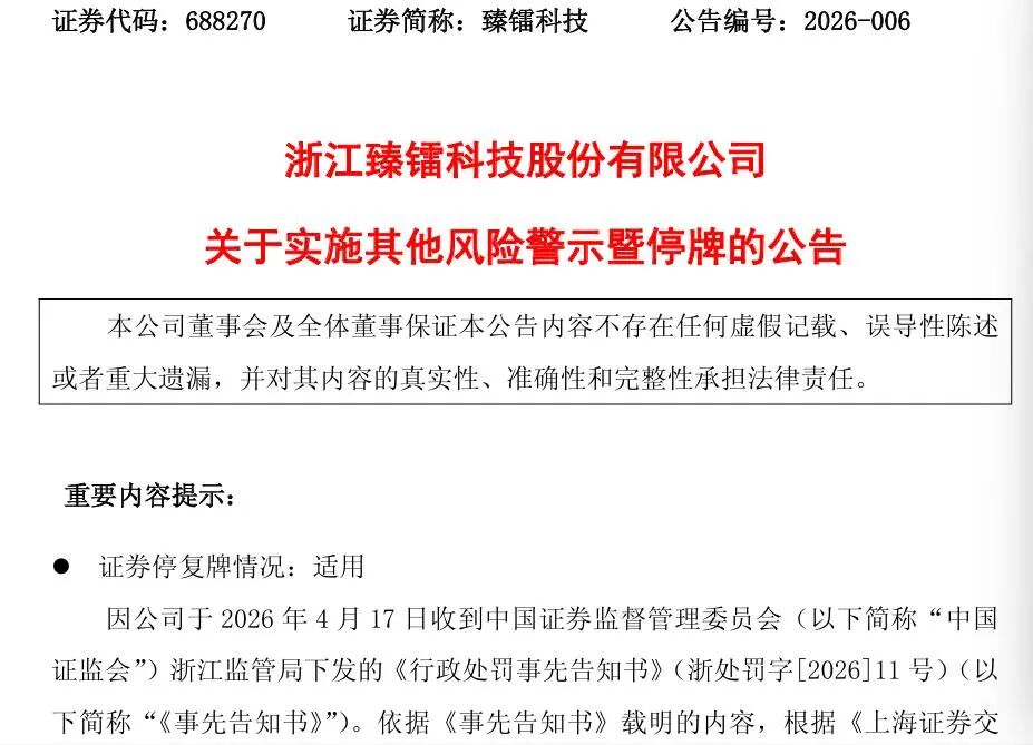 臻镭科技(688270)4月17日晚公告,公司于4月17日收到浙江证监局下发的《行政处罚事先告知书》。公司股票将被实施其他风险警示。
