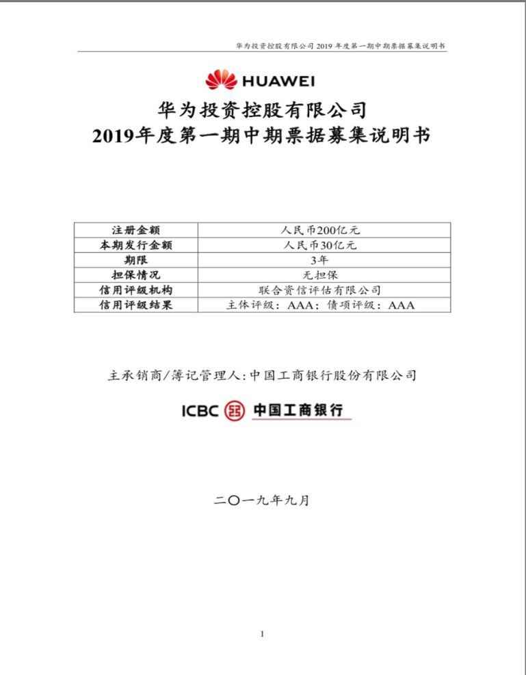 根据募集说明书显示,本次华为投资控股有限公司一共拟注册中期票据200亿元,先申请发行2期,每期30亿元,期限为3年,无担保,主承销商和簿记管理人均为中国工商银行股份有限公司。华为在说明书中表示,此次中期票据发行是针对境内合格机构投资者,将按照面值发行,发行利率通过集中簿记建档、集中配售方式确定。联合资信评估有限公司将此次债券信评为信用评级为AAA/AAA。