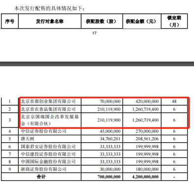 根据第一创业此前公告,首创集团斥资4.2亿认购7000万股,锁定期为48个月,北京首农斥资12.61亿认购2.1亿股,北京京国瑞国企改革发展基金(有限合伙)同样斥资12.61亿认购2.1亿股,后两者的锁定期分别为6个月。