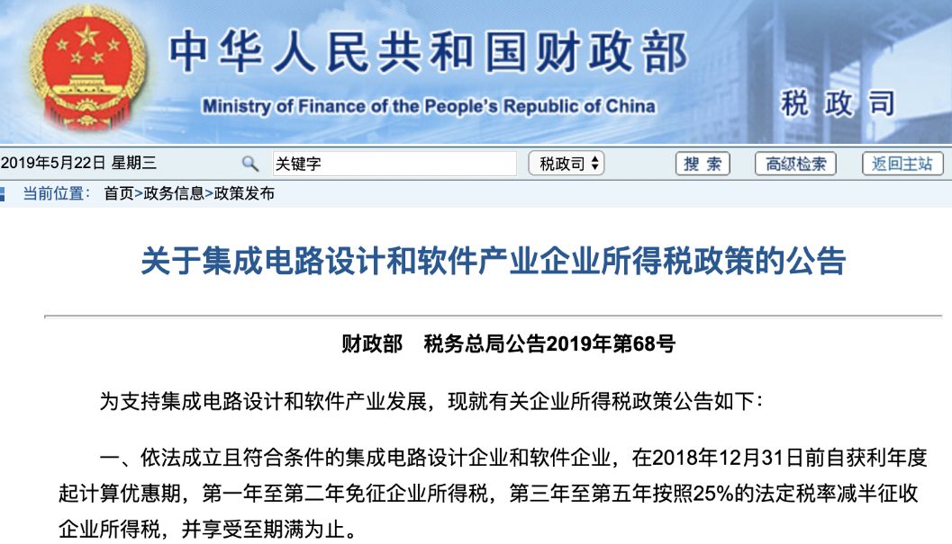 5月22日,财政部发布集成电路设计和软件产业企业所得税政策的公告。公告指出,依法成立且符合条件的集成电路设计企业和软件企业,在2018年12月31日前自获利年度起计算优惠期,第一年至第二年免征企业所得税,第三年至第五年按照25%的法定税率减半征收企业所得税,并享受至期满为止。