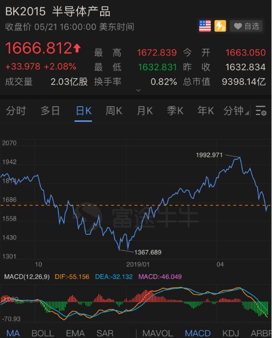 代表半导体股票综合股价动向的费城半导体指数(SOX),5月1日之后,也走出一波明显的下跌行情。特别是5月20日,美国限制措施出台当日,资金从半导体类股票流出的局面。博通和高通下跌6%,英特尔下跌了3%。