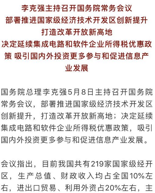 财政部的文件是对5月8日国务院常务会会议的具体落实。在5月8日会议上,国务院决定,在已对集成电路生产企业或项目按规定的不同条件分别实行企业所得税“两免三减半”或“五免五减半”的基础上,继续实施 2011 年明确的所得税“两免三减半”优惠政策。同时,有关部门要抓紧研究完善下一步促进集成电路和软件产业向更高层次发展的支持政策。