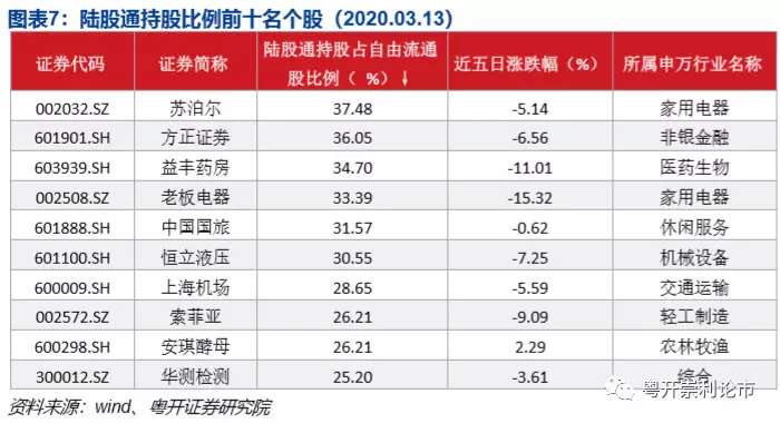 从陆股通持股比例来看,截至2020年3月13日收盘, 持股占自由流通股比例最高的是苏泊尔37.48%。从陆股通持股市值来看,截至2020年3月13日收盘,持股市值最高的是贵州茅台1148.51亿元。