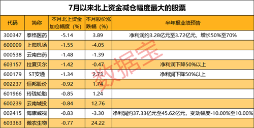 本月以来北上资金共对25股减仓幅度超0.5%,其中不乏热门白马股。泰格医药、上海机场、云南白药、拉夏贝尔和ST安通北上资金月内减仓幅度超过1%。