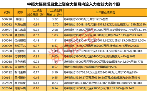 昨晚两市首份中报出炉,A股进入中报行情期。截至当前,两市共有逾600家上市公司披露了半年报业绩预告,186股业绩预增,其中14股本月获北上资金累计加仓幅度超过0.1%。