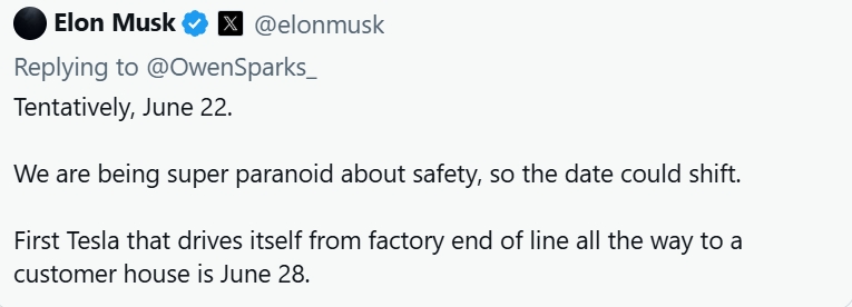 马斯克在回应X上的一名用户时表示,特斯拉将“暂定于6月22日”开始向公众提供乘车服务。不过他指出,这一日期仍有可能变动。