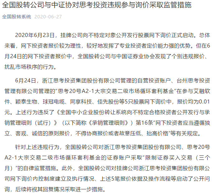 6月27日,全国股转公司与中证协对思考投资违规参与询价采取监管措施。