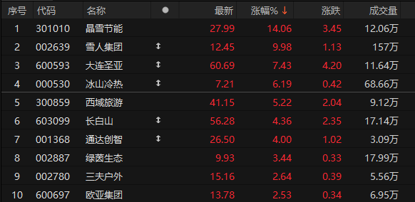 11月4日,冰雪经济概念盘中逆势活跃。11时13分,雪人集团直线拉升,1分钟内涨停。大连圣亚一度涨超9%,续创历史新高;晶雪节能、长白山、西域旅游、冰山冷热等跟涨。