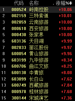 7月15日,旅游板块、酒店餐饮、机场航运板块开盘强势领涨,其中,旅游板块掀起涨停潮,截至发稿,岭南控股、三特索道、云南旅游、西安旅游、黄山旅游等多股涨停。
