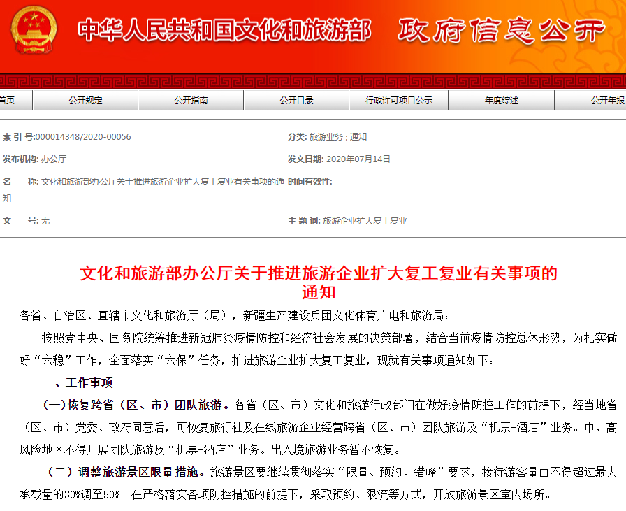 昨日晚间,文化和旅游部办公厅发布关于推进旅游企业扩大复工复业有关事项的通知。通知指出,恢复跨省(区、市)团队旅游。各省(区、市)文化和旅游行政部门在做好疫情防控工作的前提下,经当地省(区、市)党委、政府同意后,可恢复旅行社及在线旅游企业经营跨省(区、市)团队旅游及“机票+酒店”业务。中、高风险地区不得开展团队旅游及“机票+酒店”业务。