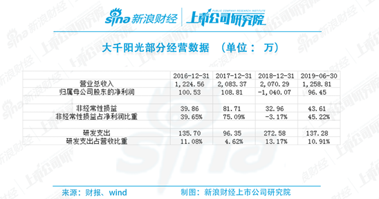 财报显示,大千阳光非经常性损益占净利润比重较大,2017年该比重曾高达75%,而非经常性损益主要为政府补助。剥离政府补助带来的收益,登陆新三板以来,大千阳光净利润均未过百万,甚至不及部分上市公司高管年收入。