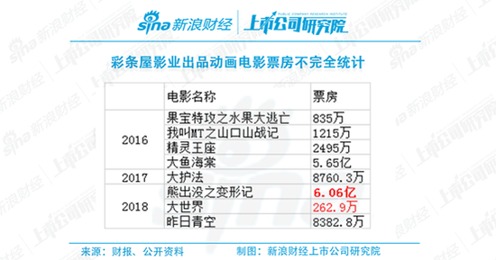 据公开资料不完全统计,2016至2018年,彩条屋出品的动画电影票房起伏较大,最高为和华强方特合作出品的《熊出没之变形记》,目标观影群众相对低龄,最终斩获6.06亿票房,最低为曾获第54届金马奖最佳动画长片的《大世界》,票房仅262.9万。