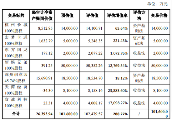 据上市公司公告,长城动漫资产重组同时收购高溢价现金收购7家动漫产业链相关公司,其中包括内容创作方向的宏梦卡通、东方国龙等,也包括衍生品销售的天芮经贸以及实景娱乐方向的滁州创意园。