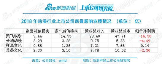 回看2018年数据,A股动漫行业的四家公司中三家净利润亏损,其中奥飞娱乐亏损达16.3亿元,当年计提商誉减值损失9.44亿元,长城动漫亏损4.49亿元,当年计提商誉减值损失3.28亿元。2018年,上述四家公司计提的商誉减值损失从0.88亿到9.44亿不等,直接拉高了当年的营业总成本,拖累公司当期净利润。