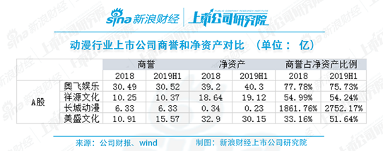 据公司财报数据显示,2019年上半年,四大动漫公司中奥飞娱乐和美盛文化商誉分别为30.52亿和15.57亿,占据前两位;从商誉占净资产的比例来看,长城动漫商誉远超于归属上市公司股东净资产,十分瞩目,2019年上半年占比高达2752.17%,商誉严重拖累公司经营。