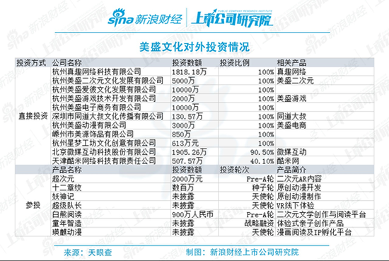 美盛文化投资和并购的公司中,稍显亮眼的是真趣网络和同道大叔,分别从事手机游戏开发和著名IP同道大叔的运营,投资金额不大,分别为1818.18万元和130.57万元,对比长城动漫出手即上千万差距明显。此外,天眼查数据显示,美盛文化还参投了部分原创动漫制作和开发、漫画阅读平台以及AR、VR相关产业公司,基本都是处于天使轮或Pre-A轮,还在孵化阶段。