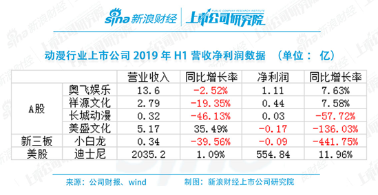 2019年半年报已经披露完毕,据财报,奥飞娱乐、祥源文化、长城动漫2019年上半年营收均下滑,其中长城动漫下滑趋势最为明显,对比去年同期减少46.13%,营收仅0.32亿元;奥飞娱乐营收13.6亿元,对比去年同期微跌2.52%,祥源文化营收2.79亿元,同比下降19.35%。四家动漫产业公司中,唯有美盛文化的营收实现增长,为5.17亿元,对比去年同期增长39.56%。