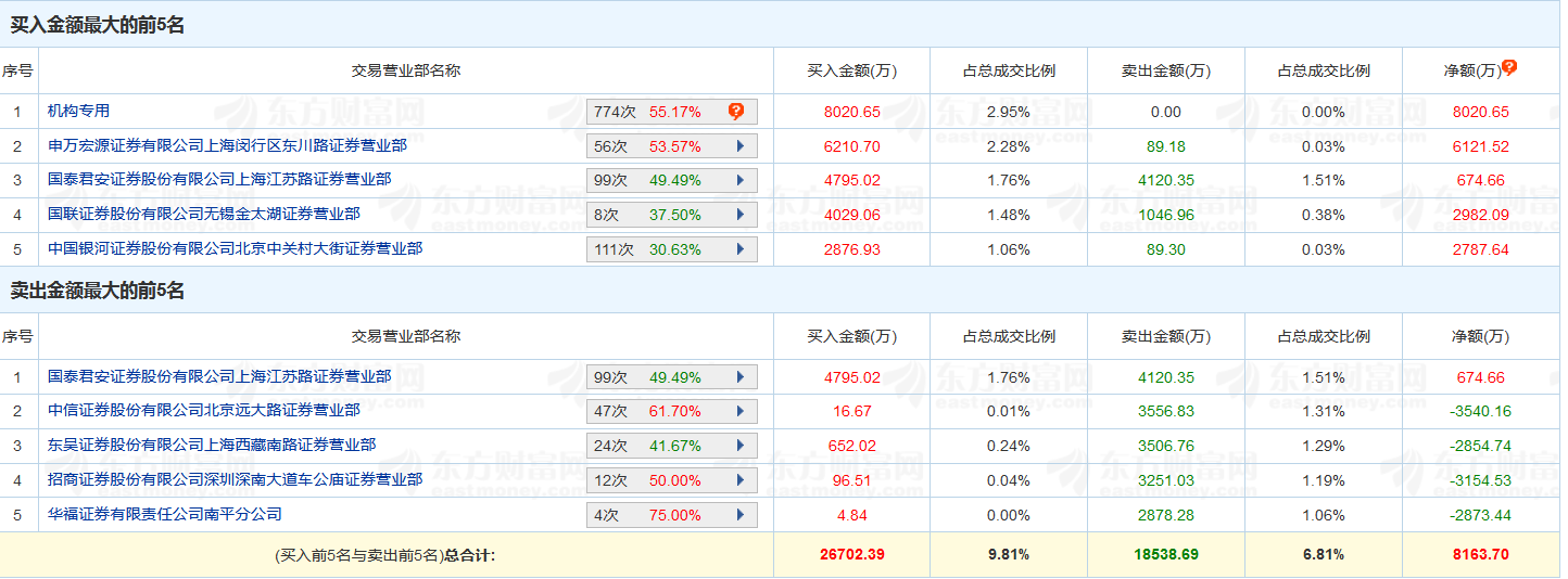买一为机构席位,大举抢筹8020万;买二席位为申万宏源上海闵行区东川路证券营业部,净买入金额为6121.5万元。