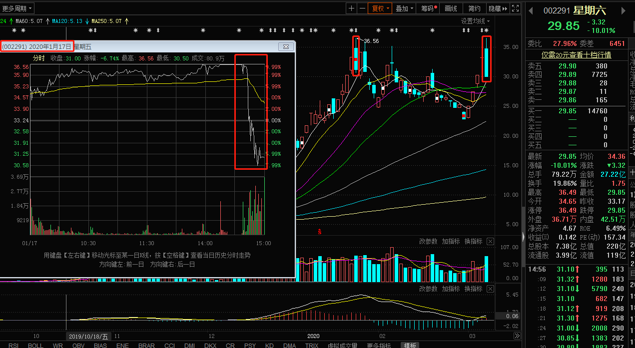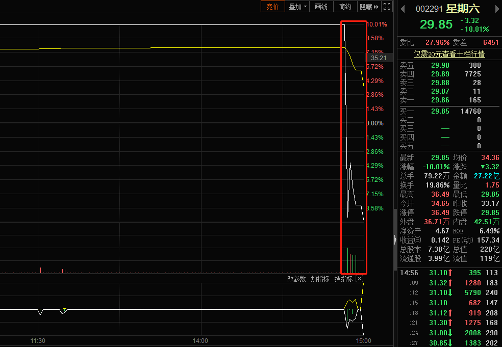 3月6日讯,4连板后,网红经济大牛股星期六今日尾盘炸板,放量跌停,上演天地板“好戏”。收盘价29.85元/股,日间振幅达20%,成交总额高达27.2亿。