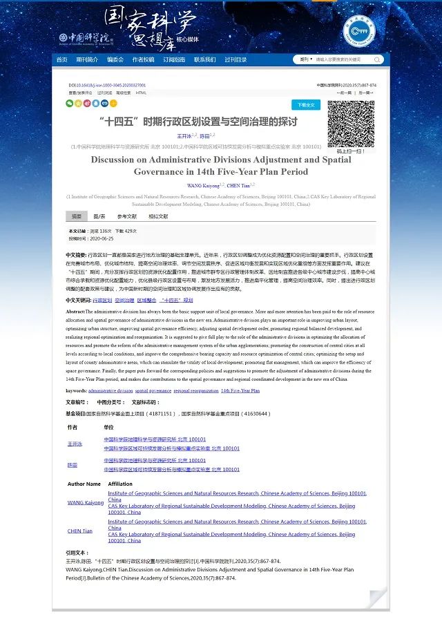 第一财经记者注意到,该篇论文的两名作者为王开泳、陈田。中国科学院官网显示,王开泳为中国科学院地理科学与资源研究所副研究员,主要从事空间规划与治理、城市与区域规划、行政区划方面研究。陈田为现任中科院地理科学与资源研究所城市与乡村发展研究室主任,主要从事城市地理、城市与区域规划、旅游规划方面的研究。