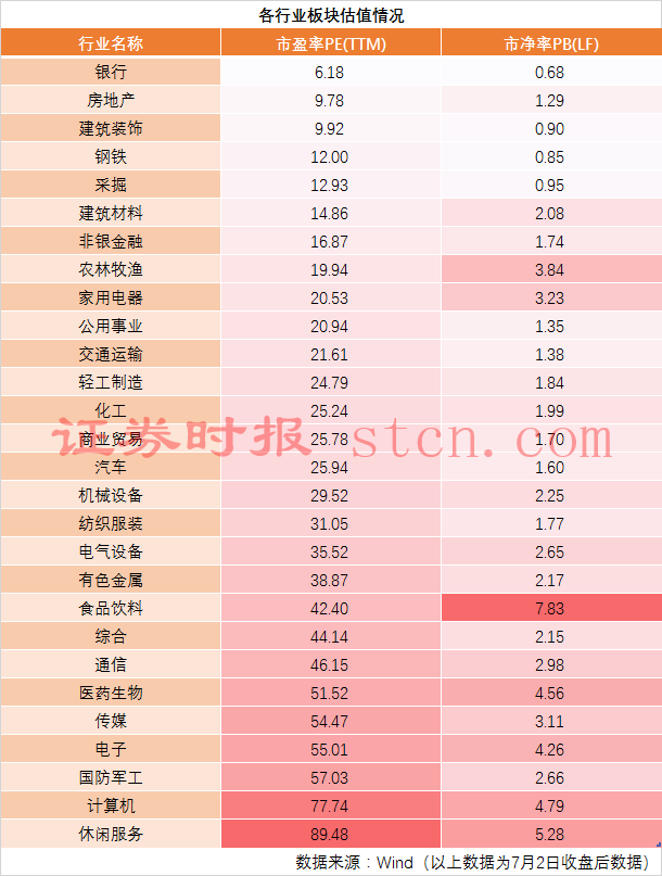 据Wind统计,截至7月2日收盘,目前市盈率且市净率均偏低的板块主要有银行、房地产、建筑装饰、钢铁、采掘等,其中,银行板块不仅市盈率(6.18倍)最低,市净率(0.68倍)也是目前最低的。