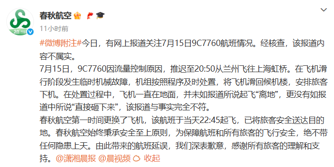 春秋航空发文表示,有网上报道关注7月15日9C7760航班情况。经核查,该报道内容不属实。