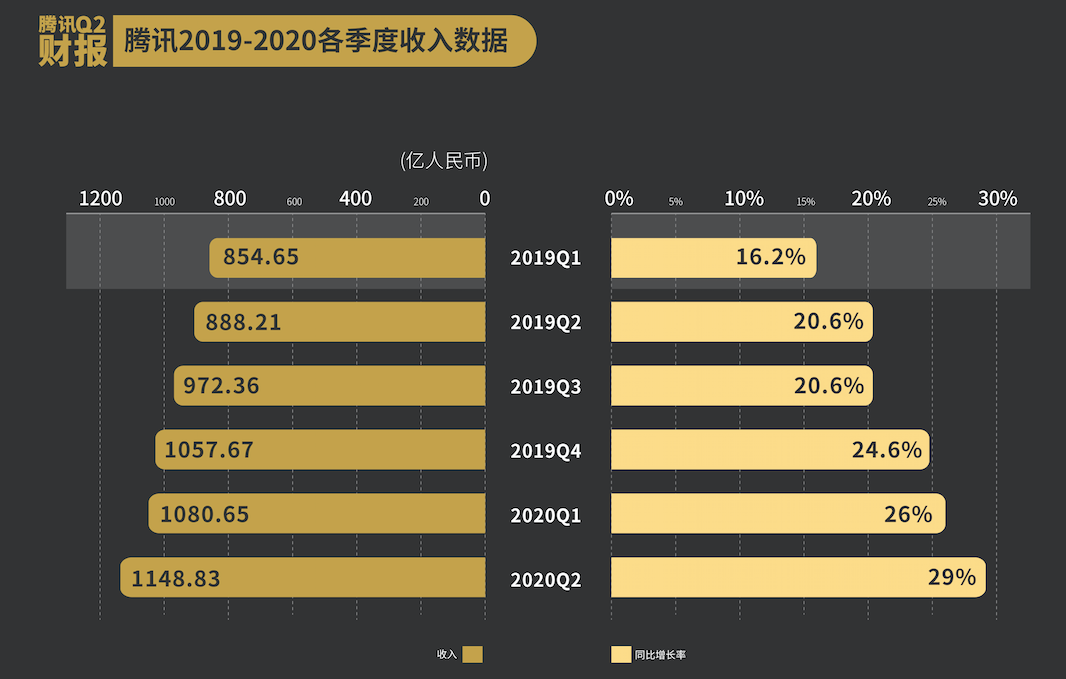 数据显示,今年二季度,腾讯的营业收入1149亿元,同比增长29%,比一季度收入高了近70亿元。