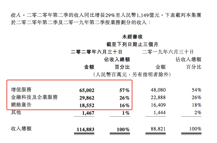 第一大项目为增值服务收入,二季度收入达到650亿元,同比增长35%,其中,尤其是增值服务中的网络游戏收入二季度增长40%至382.88亿元、社交网络收入二季度增长29%至267.14亿元。