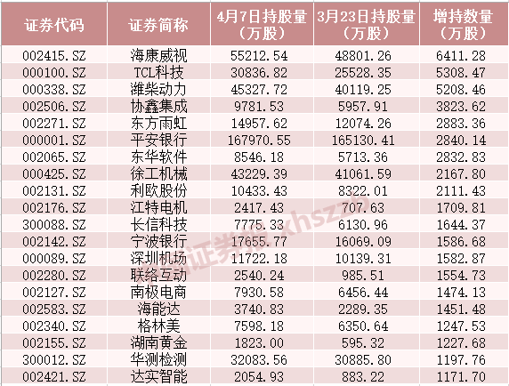 深股通方向,3月24日-4月7日,北向资金对432只个股进行增持,其中,海康威视增持数量最多,为6411.28万股,此外,TCL科技、潍柴动力增持数量超过5000万股。