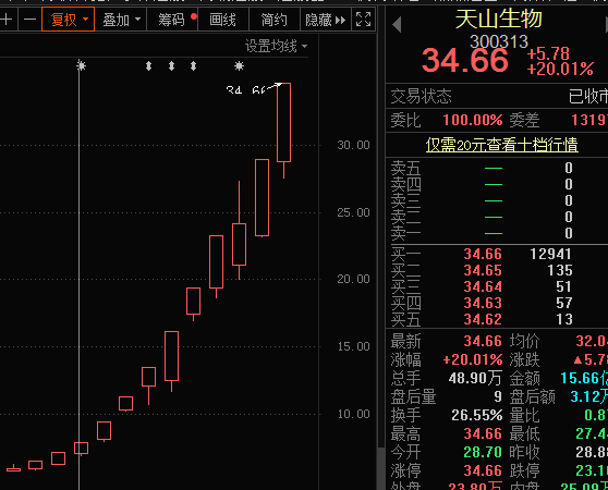 涨幅情况来看,创业板股霸屏今日两市涨幅榜前50位。截至收盘,共有61只创业板股大涨10%以上,其中涨停股24只,是创业板注册制实施以来涨停数量最多的一天。要论头号牛股,自然还是天山生物,尽管日前已提示控股股东高质押、业绩风险、牛育肥业务不确定性等九大风险,但投资者对天山生物的追捧却并未止步。