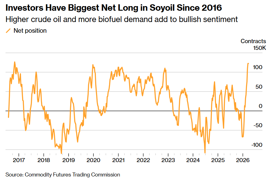伊朗战争抬高原油和柴油价格后,可再生柴油与生物柴油相对于传统柴油的经济性同步改善,市场随即上修对生物燃料原料的需求预期;而豆油恰恰是美国生物质柴油体系里最关键的原料之一,所以机构资金选择会直接买入豆油期货,提前反映未来更强的工业需求。
