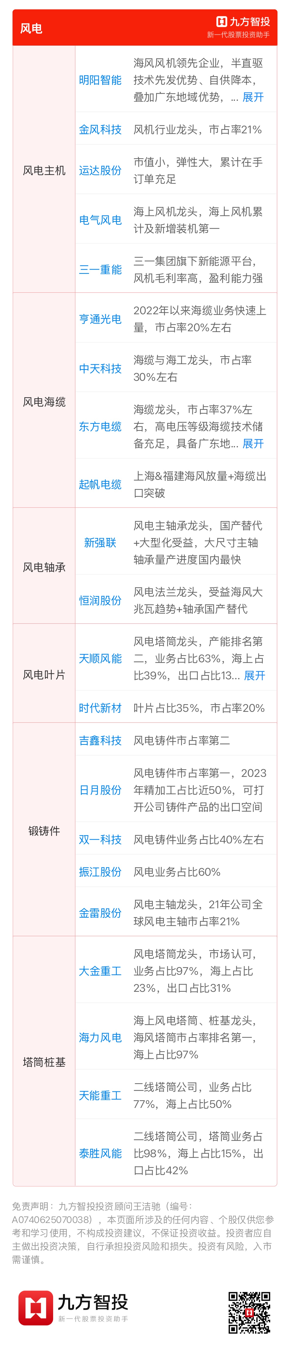 建议关注金风科技(002202.SZ)、明阳智能(601615.SH)、运达股份(300772.SZ)、三一重能(688349.SH)。