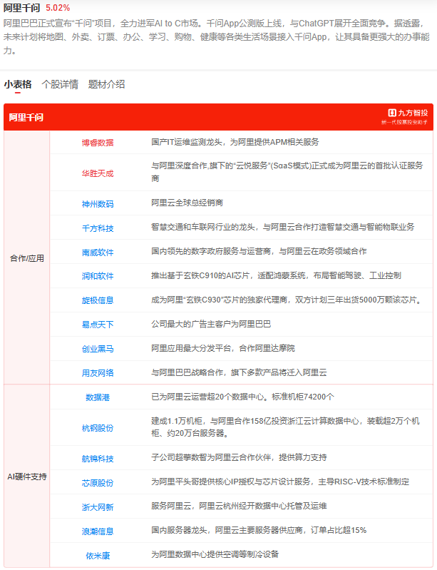 华西证券指出,伴随阿里最新季报中阿里云AI收入超预期的增长,AI产品正在逐渐成为阿里云增长的核心驱动力,“通义”App正式完成品牌升级更名为“千问”,标志产品进入全新发展阶段。在当前时点,重点关注阿里在AI侧从to B向to C突破进展,C端AI应用有望成为2026年重要突破方向之一。同时,相对激进的资本投入有望推动国产算力基础设施建设加速,中长期看好中大型客户的定制化数据中心或公有云服务商为主。