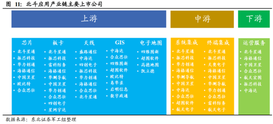天风证券研报认为,行业的价值量正逐步往产业链中下游倾斜,公路及消费者导航业务为主要的下游应用。目前全球和我国卫星导航与位置服务产业链大体可以分为上游的基础数据、基础器件、和基础软件(GNSS接收机+电子地图),上游基础产品研制、生产及销售环节,是产业体现中国技术的关键;中游是当前产业发展的重点环节,主要包括各类终端集成和系统集成产品研制、生产及销售;下游是基于各种技术和产品的应用及运营服务环节。