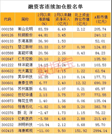 在上述融资客连续加仓的18股中,常山北明2月以来累计涨幅83.59%排名首位。杭钢股份、东湖高新、楚江新材、高能环境、仁东控股等累计涨幅也在20%以上。