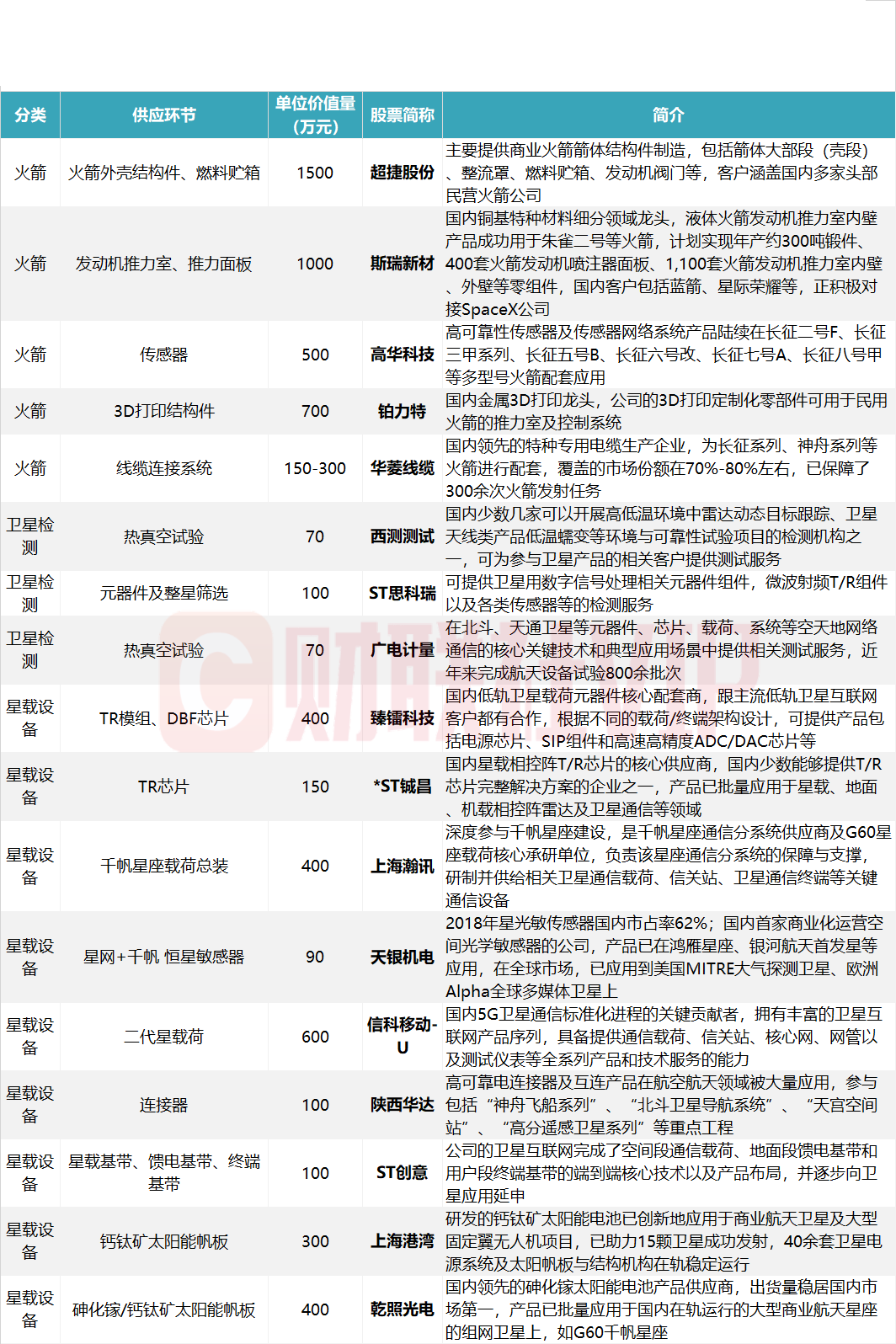 在商业航天产业链价值量中,在火箭领域,供应环节为火箭外壳结构件、燃料贮箱的单位价值量为1500万元,涉及的上市公司为超捷股份;供应环节为发动机推力室、推力面板的单位价值量为1000万元,涉及的上市公司为斯瑞新材;供应环节为传感器的单位价值量为500万元,涉及的上市公司为高华科技;供应环节为3D打印结构件的单位价值量为700万元,涉及的上市公司为铂力特;供应环节为线缆连接系统的单位价值量为150-300万元,涉及的上市公司为华菱线缆。