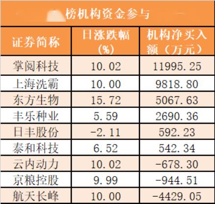 盘后龙虎榜数据显示,机构现身9股,其中掌阅科技等6股呈现机构资金净买入,航天长峰等3股呈现机构资金净卖出。