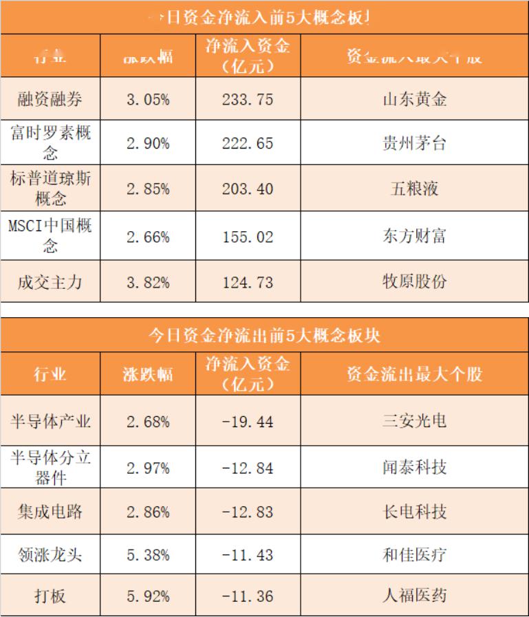 概念板块方面,今日融资融券、富时罗素概念、标普道琼斯概念、MSCI中国等概念板块资金呈现净流入,其中融资融券概念净流入233.75亿元居首。