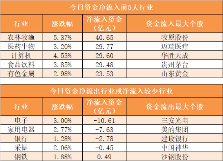 28个申万一级行业中,24个行业实现资金净流入,其中农林牧渔行业净流入40.65亿元居首。