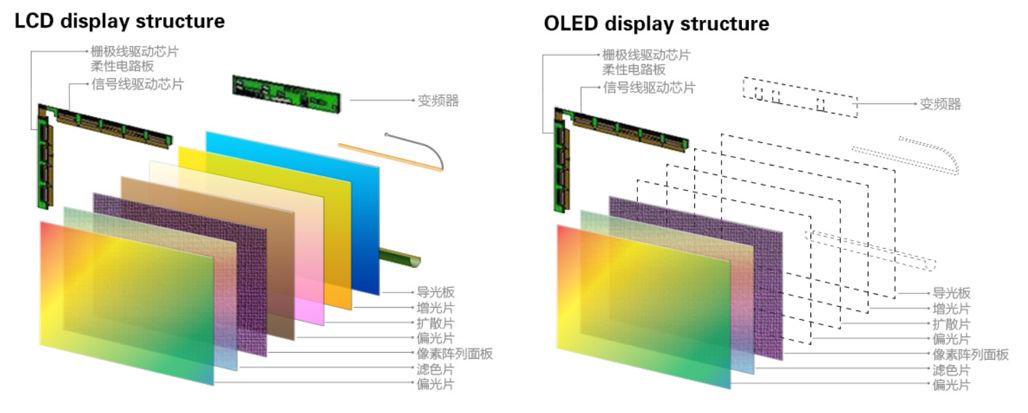 由于AMOLED是自发光结构,不需要背光源,因此体积更轻薄。同时由于自发光的特性,AMOLED在暗画面下的功耗远低于LCD,因此拥有节能的特性。
