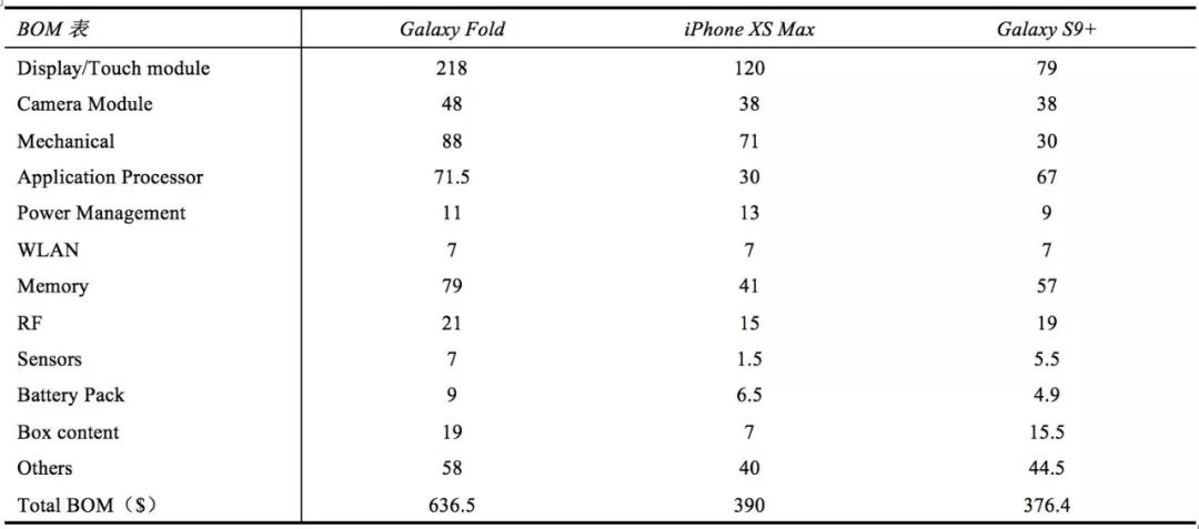 ▼ GalaxyFold、iPhone XS Max、Galaxy S9+ BOM表对比
