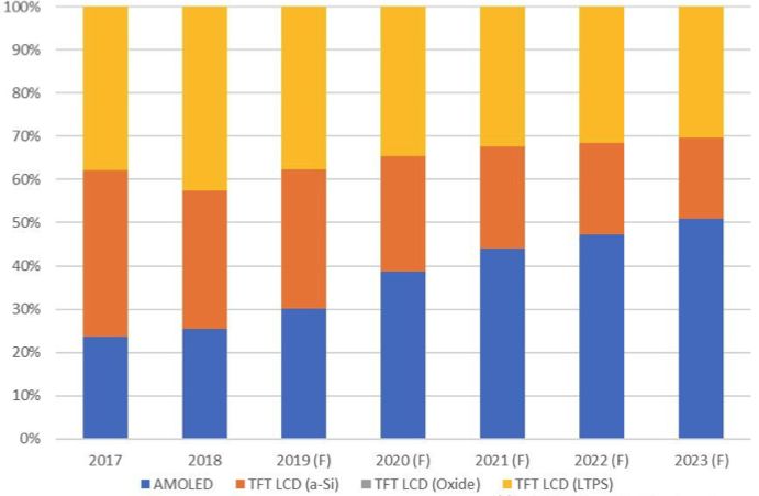 近年来,随着曲面屏、窄边框、屏下指纹识别技术、屏下摄像头技术等技术的推动,AMOLED正迅速夺取现有TFT-LCD手机显示的市场份额,在智能终端中渗透率快速提升。
