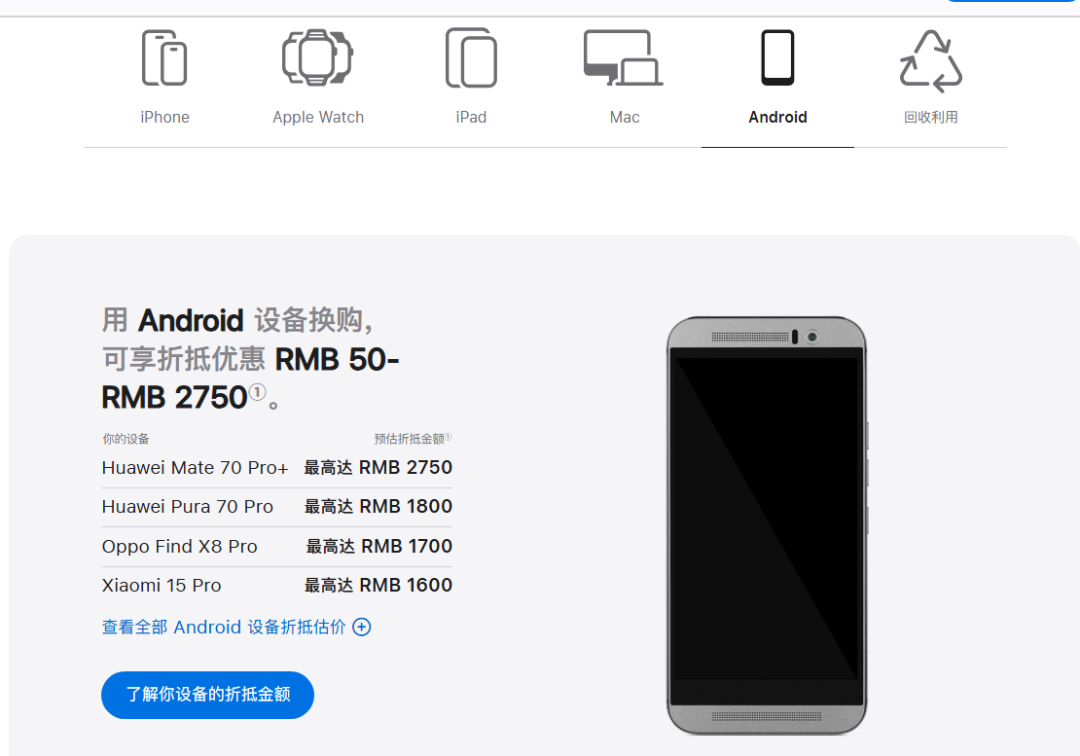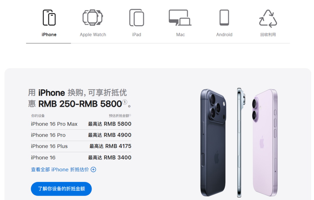 显示,苹果调整了iPhone、iPad、Mac等设备“以旧换新”折抵价,华为、小米等安卓机型也被纳入折抵范围。