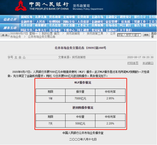 8月17日和26日分别有4000亿元和1500亿元MLF到期,央行此次操作实现净投放3400亿元。