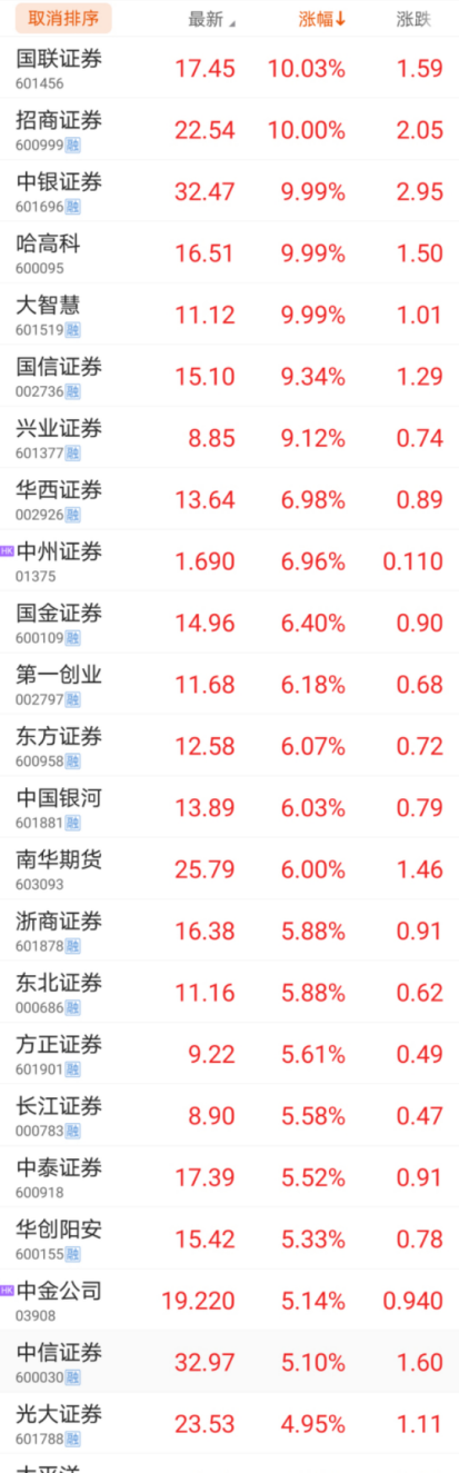 证券股唱“主角”,截至收盘,招商证券、国联证券、哈高科、中银证券等4股涨停,国信证券临近收盘打开涨停,涨幅超过5%的券商股高达18只。