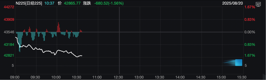 日本股市周三开盘后持续走低,日经225指数一度跌超1.5%。分析师表示,日经225指数在接近年底时可能会从近期纪录高位回落,不过这在很大程度上取决于美日脆弱的贸易协定。接受调查的18位分析师的预估中值显示,该指数今年迄今已上涨逾9%,但预计将在12月底回落至42000点。目前,日经225指数在43000点左右。