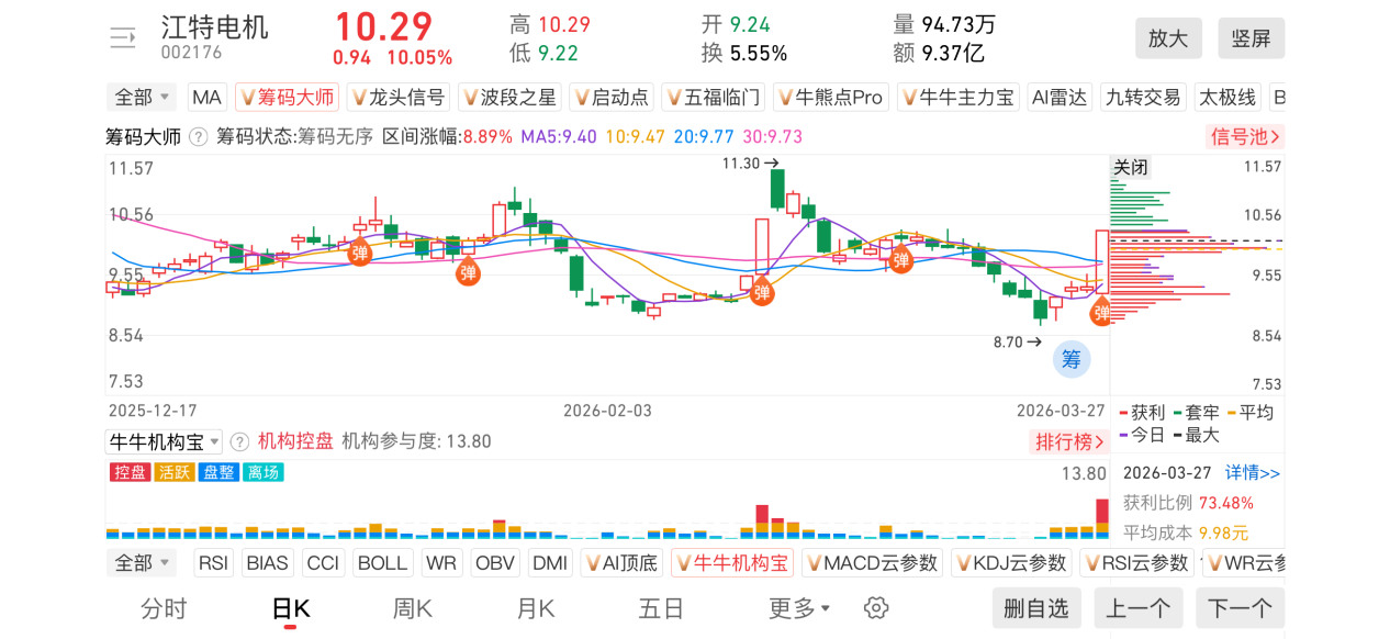 1)20260327-江特电机-002176-【筹码大师】和【牛牛机构宝】-近期出现弹信号且底部量柱由绿转红
