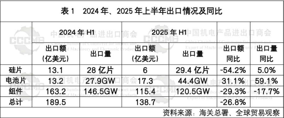 中国机电产品进出口商会发文称,2025年上半年,在全球关税政策、产能迁移、市场中心转移等多重因素共同作用下,我国光伏产品出口额为138.7亿美元,同比下降26.8%,出口品类出现明显分化:除电池片出口额同比大幅增长外,硅片与组件出口额同比均大幅下滑。